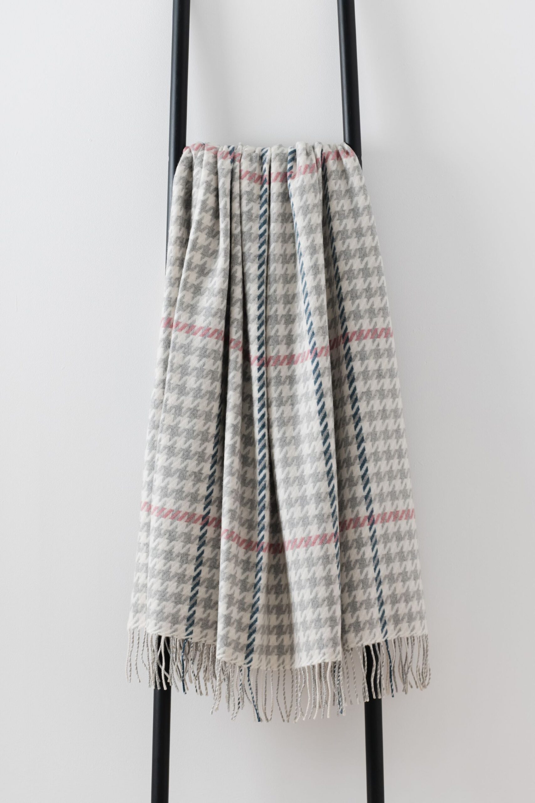Distinctive mercury grey and ecru merino lambswool throw featuring a striking houndstooth design with a subtle overlayed check.