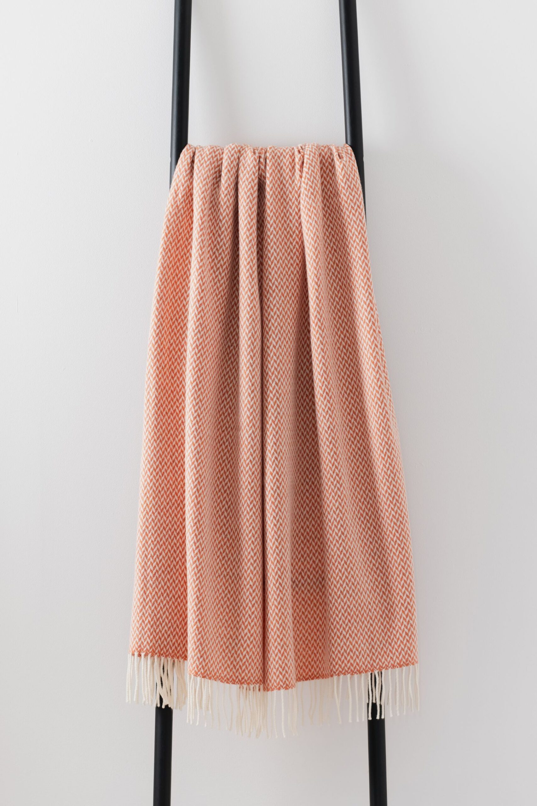 Bright tangerine and ecru merino lambswool throw featuring the natural chic of a delicate dogtooth design
